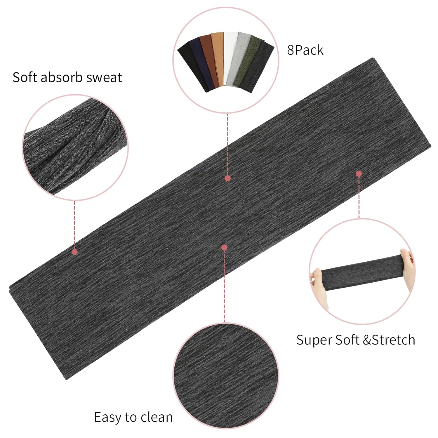 8 Pack Sport Headbands for Women, Elastic Soft Fabric Non-Slip Hair Bands Hair Warp for Daily Workout Yoga Running Sports